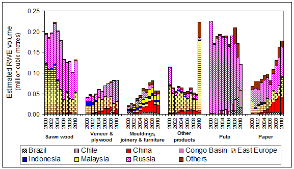 in imports of wood-based products from the selected countries (2000-2010) Imports