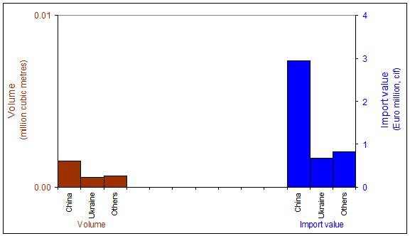 The following charts indicate which of "the selected countries" are likely to supply Czech Republic with the greatest quantity of each of the selected products. They implicitly suggest priorities for scrutiny by Competent Authorities and Monitoring Organisations. Information about the trade in wood-based products of a number of those countries is available via the Home Page of this website "The selected countries" comprise all countries other than Australia, Canada, New Zealand, Norway, Switzerland, the USA and all EU member states. Timber sector products are defined in this and related documents as all products classified in the UN Harmonised System under the following headings: 4403 to 4421 inclusive, 940161, 940169, 94019030, 940330, 940340, 940350, 940360, and 94039030. Paper sector products are defined in this and related documents as all products classified in the UN Harmonised System under the following headings: 44012, 44013, 4701 to 4705 inclusive, and 48. The source on which statistics for the imports of EU member states is Eurostat. Estimates of roundwood equivalent ("RWE") volume have been derived from source data as indicated in http://www.globaltimber.org.uk/RWEvolume.htm |