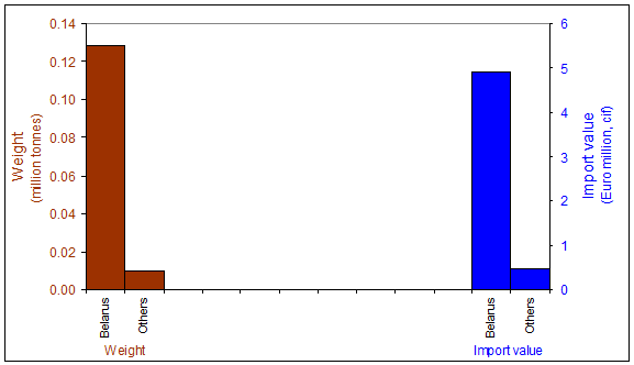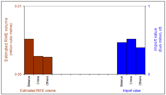 The following charts indicate which of "the selected countries" are likely to supply Lithuania with the greatest quantity of each of the selected products. They implicitly suggest priorities for scrutiny by Competent Authorities and Monitoring Organisations. Information about the trade in wood-based products of a number of those countries is available via the Home Page of this website "The selected countries" comprise all countries other than Australia, Canada, New Zealand, Norway, Switzerland, the USA and all EU member states. Timber sector products are defined in this and related documents as all products classified in the UN Harmonised System under the following headings: 4403 to 4421 inclusive, 940161, 940169, 94019030, 940330, 940340, 940350, 940360, and 94039030. Paper sector products are defined in this and related documents as all products classified in the UN Harmonised System under the following headings: 44012, 44013, 4701 to 4705 inclusive, and 48. The source on which statistics for the imports of EU member states is Eurostat. Estimates of roundwood equivalent ("RWE") volume have been derived from source data as indicated in http://www.globaltimber.org.uk/RWEvolume.htm |