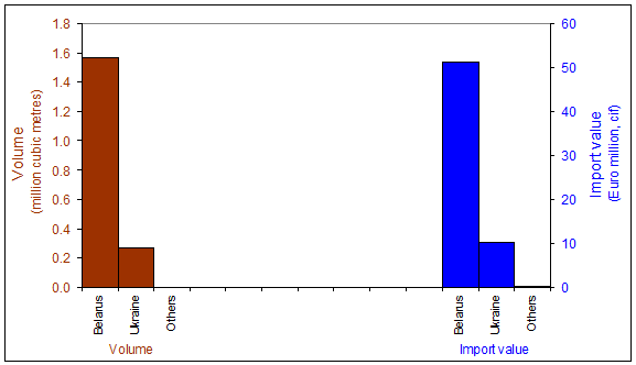 The following charts indicate which of "the selected countries" are likely to supply Poland with the greatest quantity of each of the selected products. They implicitly suggest priorities for scrutiny by Competent Authorities and Monitoring Organisations. Information about the trade in wood-based products of a number of those countries is available via the Home Page of this website "The selected countries" comprise all countries other than Australia, Canada, New Zealand, Norway, Switzerland, the USA and all EU member states. Timber sector products are defined in this and related documents as all products classified in the UN Harmonised System under the following headings: 4403 to 4421 inclusive, 940161, 940169, 94019030, 940330, 940340, 940350, 940360, and 94039030. Paper sector products are defined in this and related documents as all products classified in the UN Harmonised System under the following headings: 44012, 44013, 4701 to 4705 inclusive, and 48. The source on which statistics for the imports of EU member states is Eurostat. Estimates of roundwood equivalent ("RWE") volume have been derived from source data as indicated in http://www.globaltimber.org.uk/RWEvolume.htm |