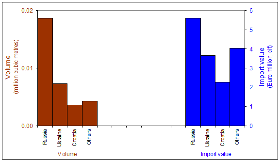 The following charts indicate which of "the selected countries" are likely to supply Sweden with the greatest quantity of each of the selected products. They implicitly suggest priorities for scrutiny by Competent Authorities and Monitoring Organisations. Information about the trade in wood-based products of a number of those countries is available via the Home Page of this website "The selected countries" comprise all countries other than Australia, Canada, New Zealand, Norway, Switzerland, the USA and all EU member states. Timber sector products are defined in this and related documents as all products classified in the UN Harmonised System under the following headings: 4403 to 4421 inclusive, 940161, 940169, 94019030, 940330, 940340, 940350, 940360, and 94039030. Paper sector products are defined in this and related documents as all products classified in the UN Harmonised System under the following headings: 44012, 44013, 4701 to 4705 inclusive, and 48. The source on which statistics for the imports of EU member states is Eurostat. Estimates of roundwood equivalent ("RWE") volume have been derived from source data as indicated in http://www.globaltimber.org.uk/RWEvolume.htm |